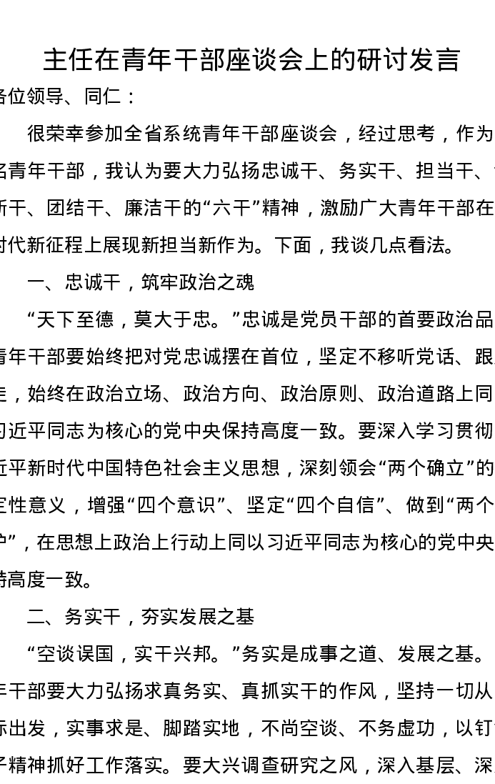 主任在青年干部座谈会上的研讨发言