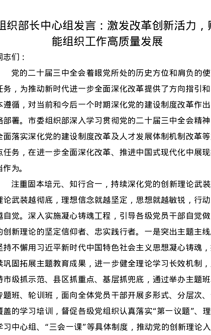 组织部长中心组发言:激发改革创新活力,赋能组织工作高质量发展