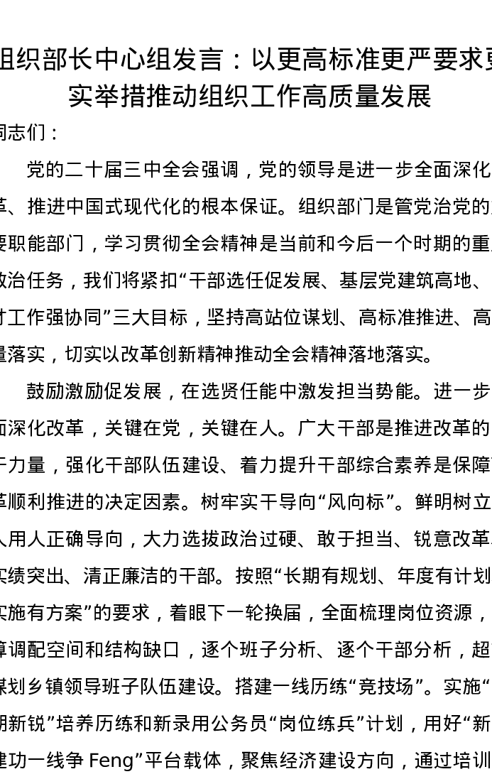 组织部长中心组发言:以更高标准更严要求更实举措,推动组织工作高质量发展