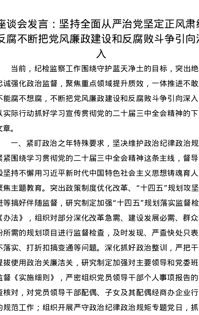 座谈会发言坚持全面从严治党,坚定正风肃纪反腐,不断把党风廉政建设和反腐败斗争引向深入