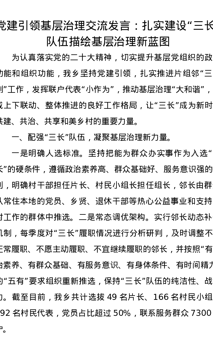 党建引领基层治理交流发言:扎实建设“三长”队伍,描绘基层治理新蓝图
