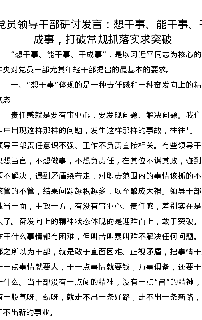 党员领导干部研讨发言:想干事、能干事、干成事,打破常规抓落实求突破