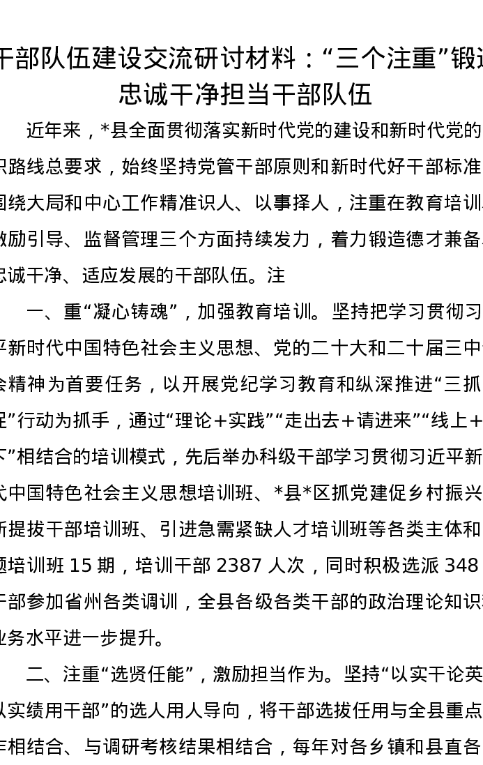 干部队伍建设交流研讨发言材料:“三个注重”锻造忠诚干净担当干部队伍