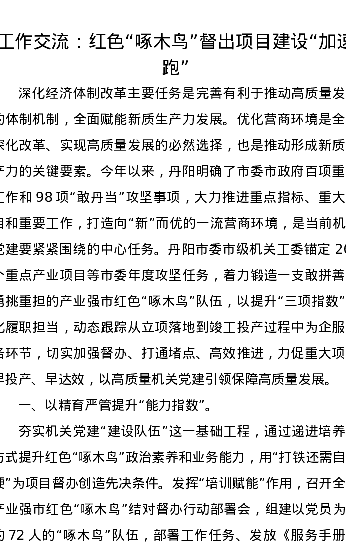 工作交流发言:红色“啄木鸟”督出项目建设“加速跑”