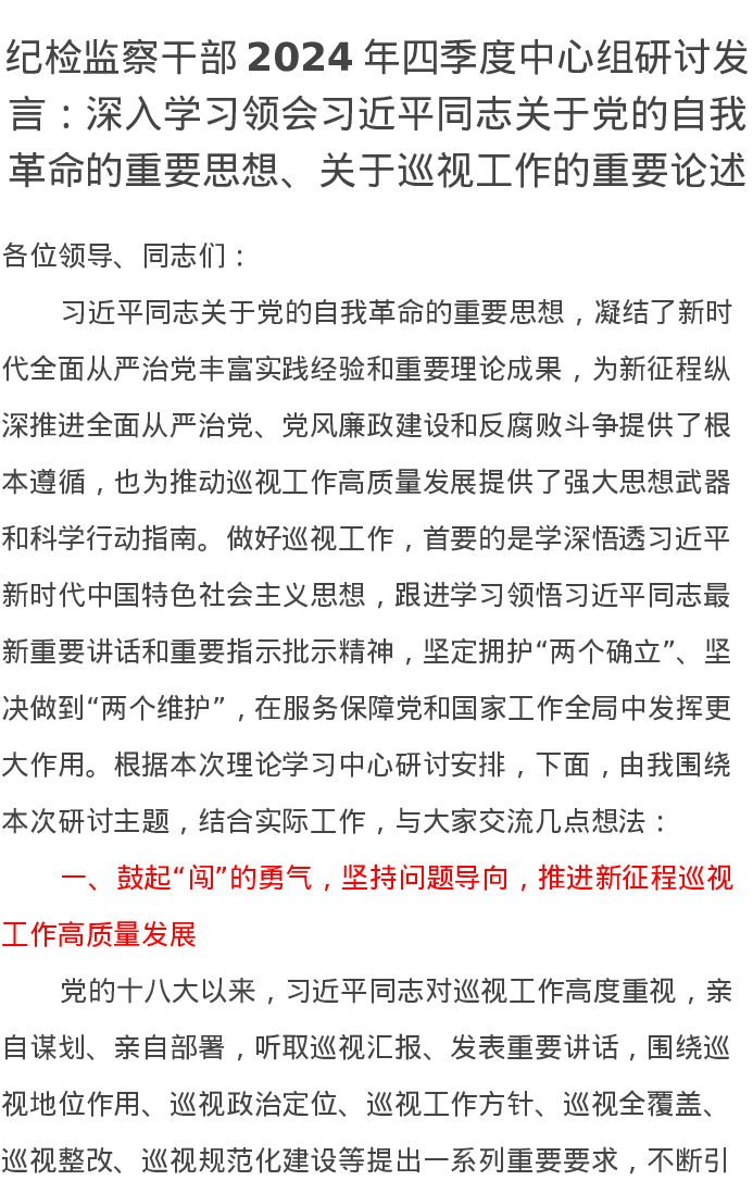 纪检监察干部2024年四季度中心组研讨发言:深入学习领会习近平总书记关于党的自我革命的重要思想、关于巡视工作的重要论述