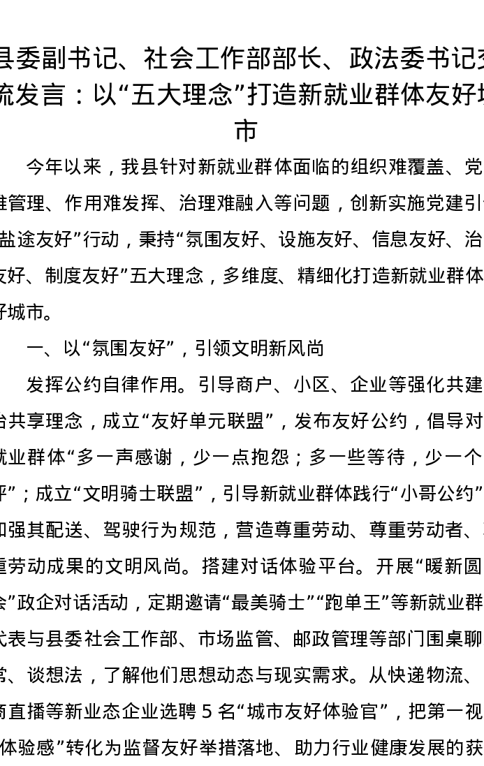 县委副书记、社会工作部部长、政法委书记交流发言:以“五大理念”打造新就业群体友好城市