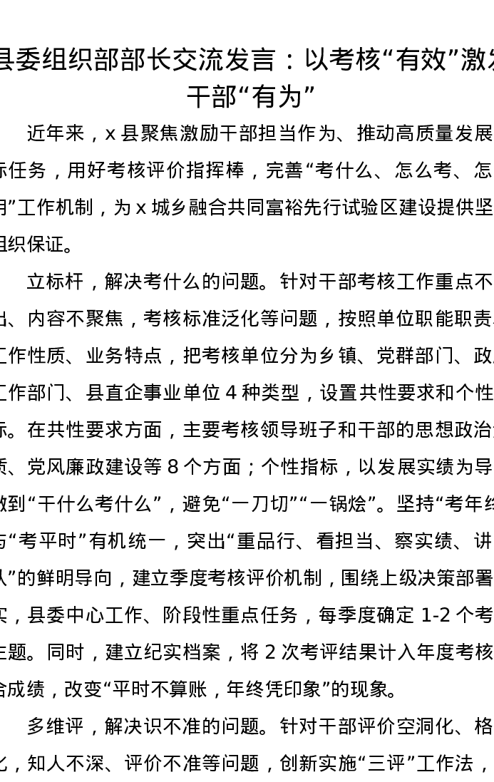 县委组织部部长交流发言:以考核“有效”激发干部“有为”
