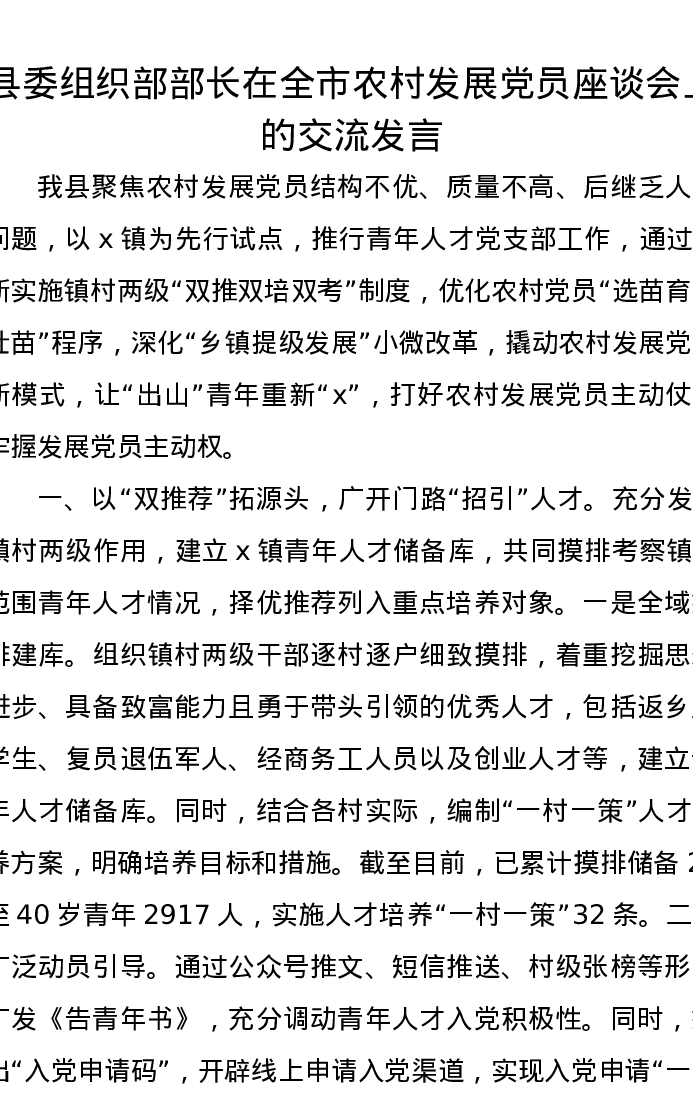 县委组织部部长在全市农村发展党员座谈会上的交流发言