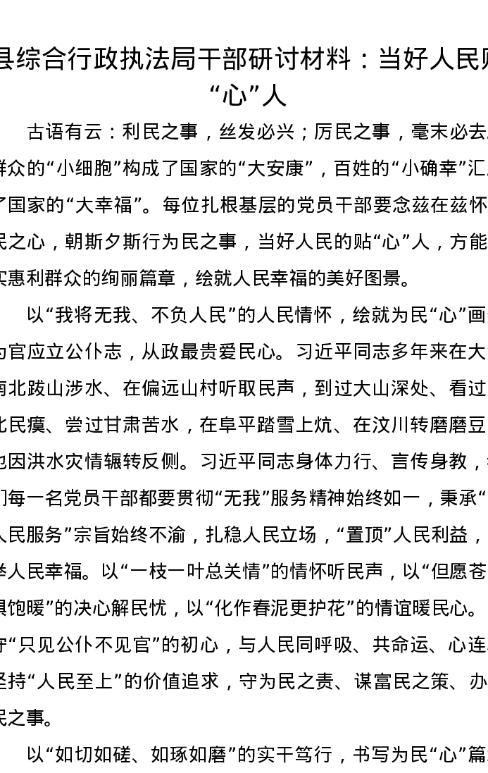 县综合行政执法局干部研讨发言材料:当好人民贴“心”人