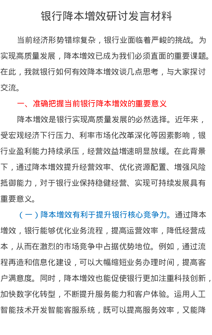 银行降本增效研讨发言材料