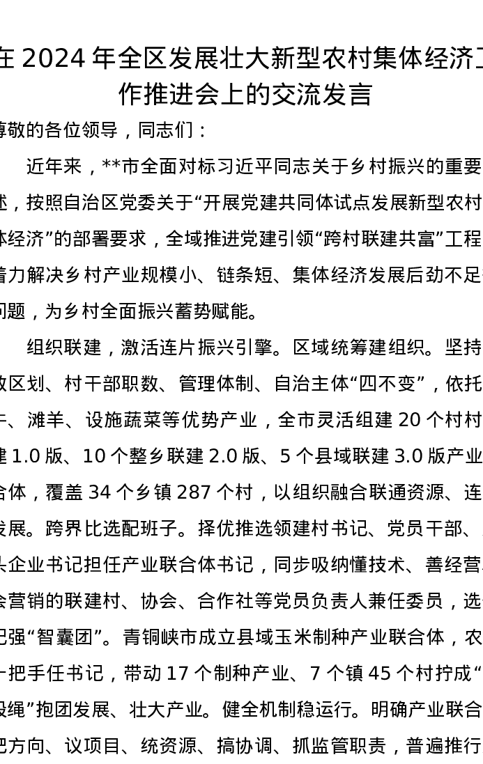 在2024年全区发展壮大新型农村集体经济工作推进会上的交流发言