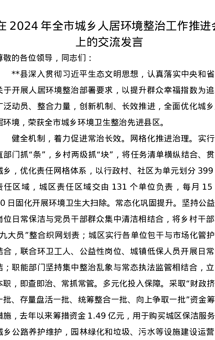 在2024年全市城乡人居环境整治工作推进会上的交流发言