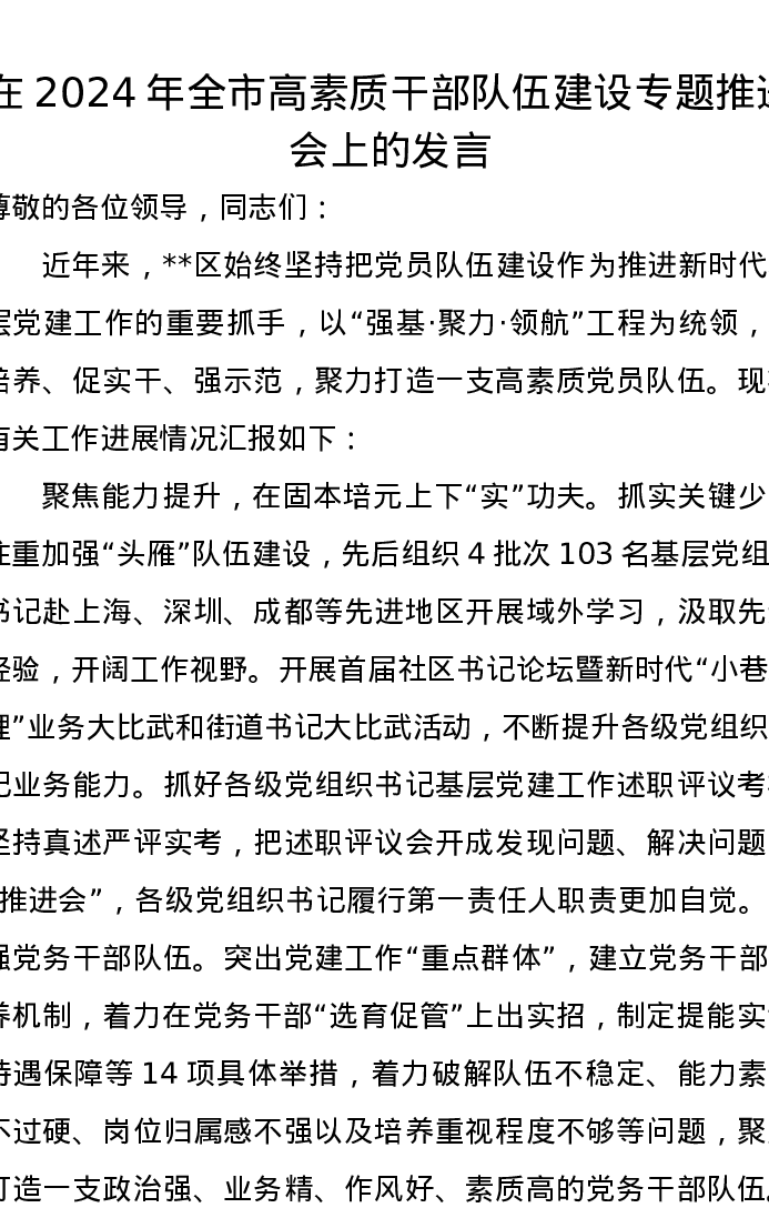 在2024年全市高素质干部队伍建设专题推进会上的发言