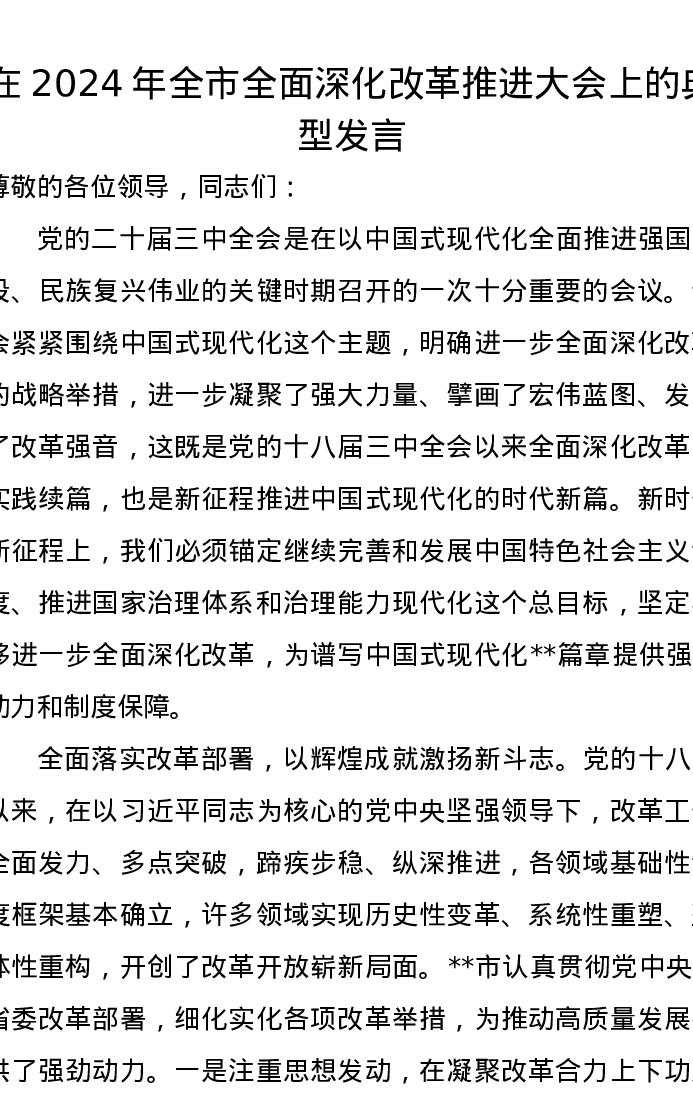 在2024年全市全面深化改革推进大会上的典型发言