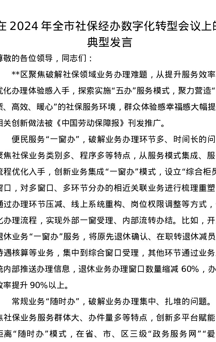 在2024年全市社保经办数字化转型会议上的典型发言