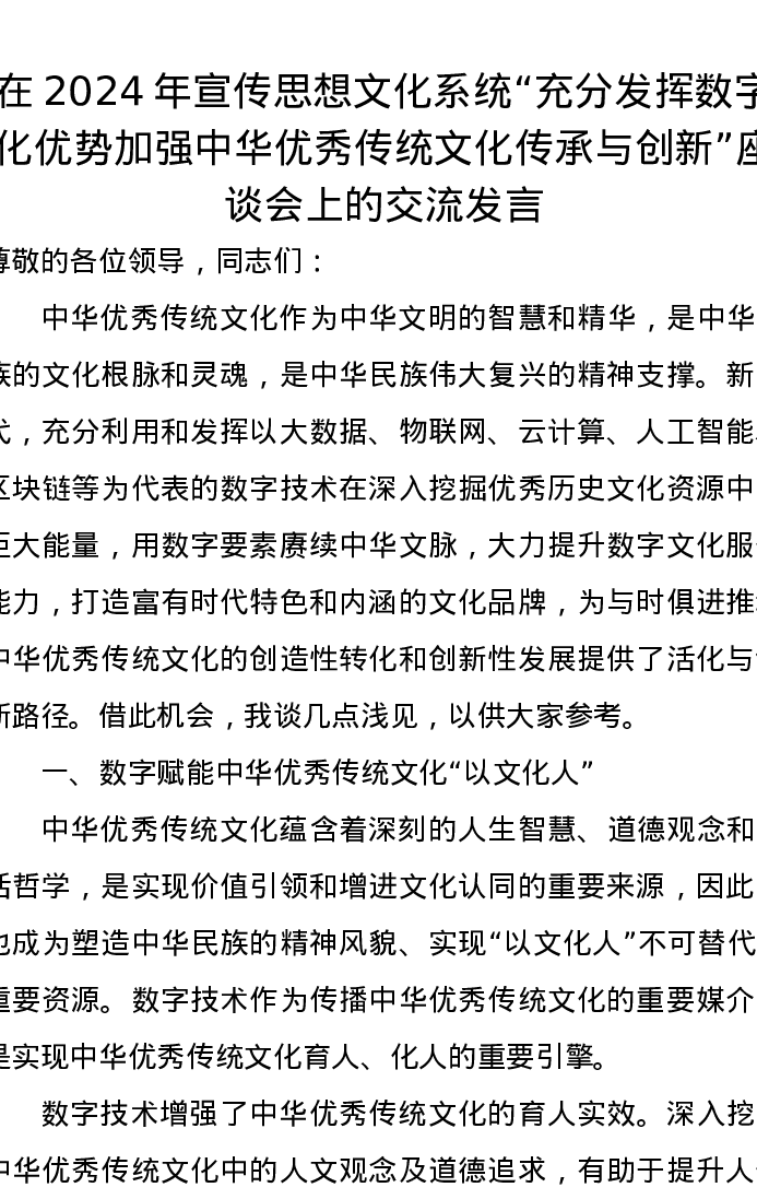 在2024年宣传思想文化系统“充分发挥数字化优势,加强中华优秀传统文化传承与创新”座谈会上的交流发言