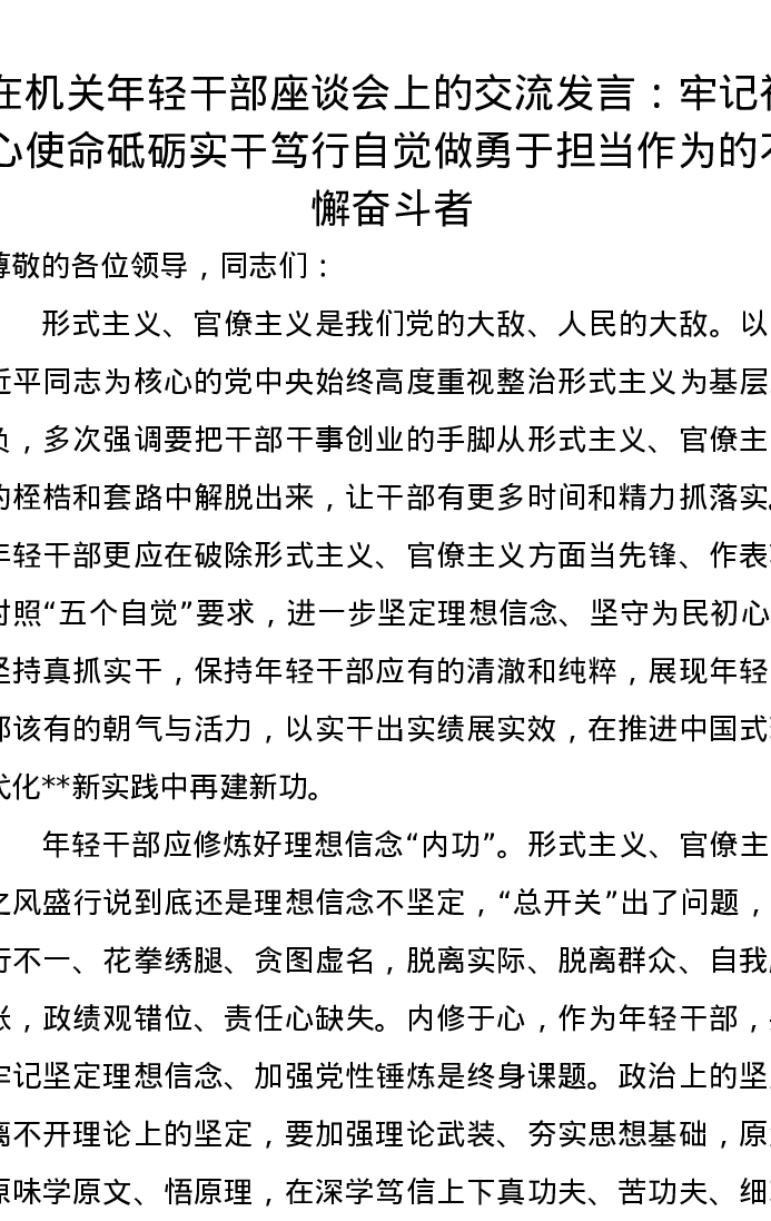 在机关年轻干部座谈会上的交流发言:牢记初心使命,砥砺实干笃行,自觉做勇于担当作为的不懈奋斗者