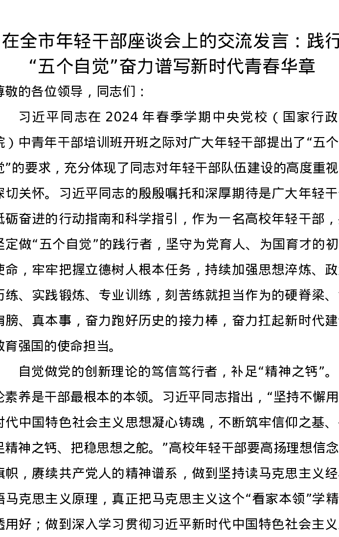 在全市年轻干部座谈会上的交流发言:践行“五个自觉”,奋力谱写新时代青春华章