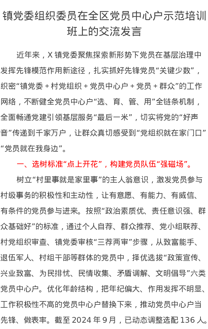 镇党委组织委员在全区党员中心户示范培训班上的交流发言