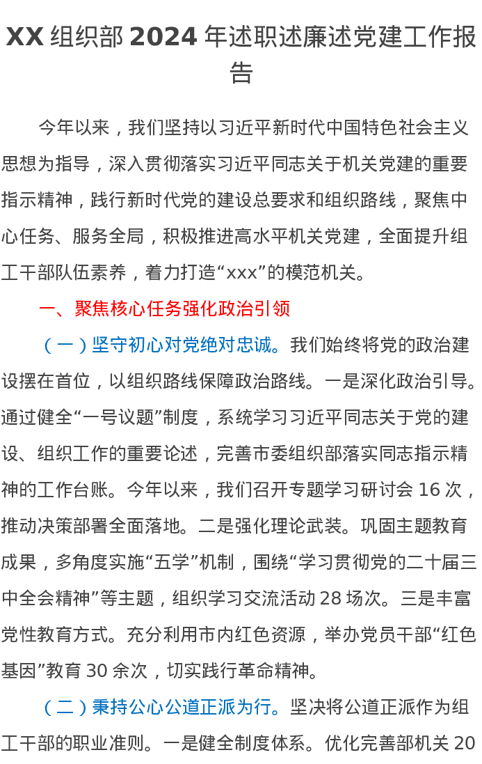 XX组织部2024年述职述廉述党建工作报告