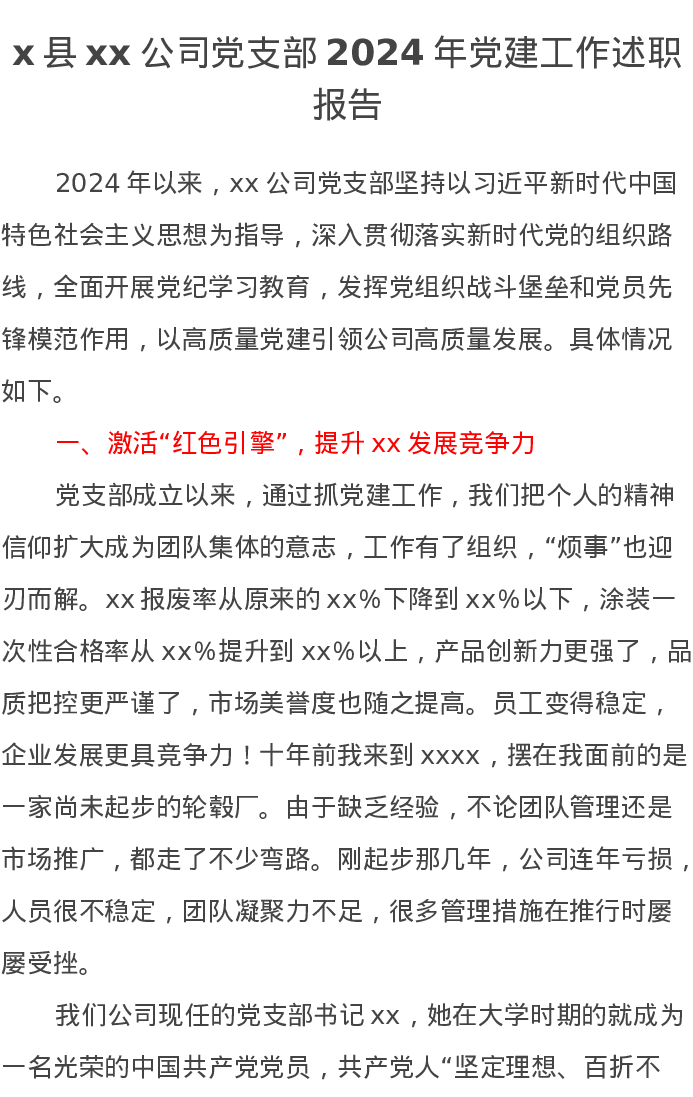x县xx公司党支部2024年党建工作述职报告