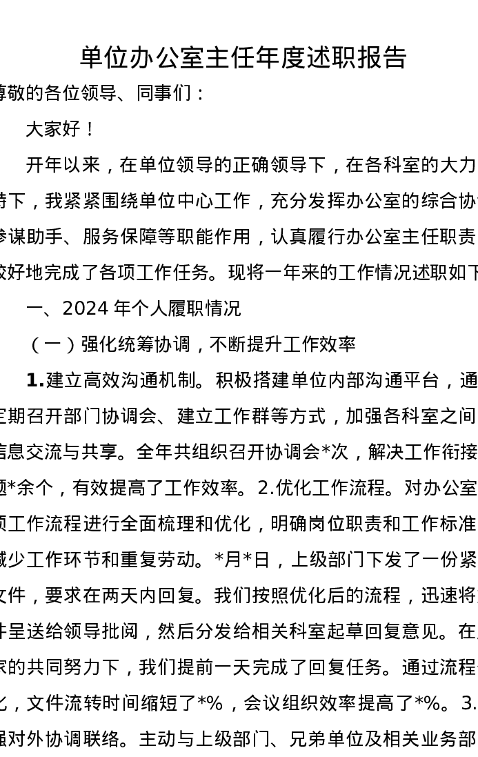单位办公室主任年度述职报告