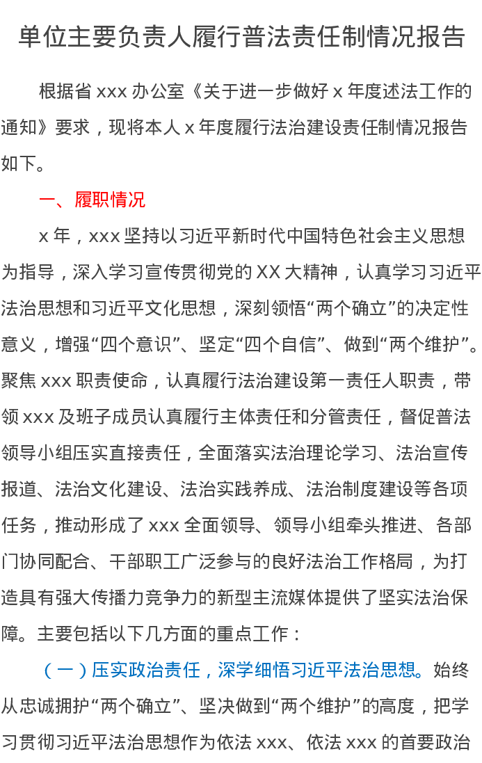 单位主要负责人履行普法责任制情况报告(述法报告)