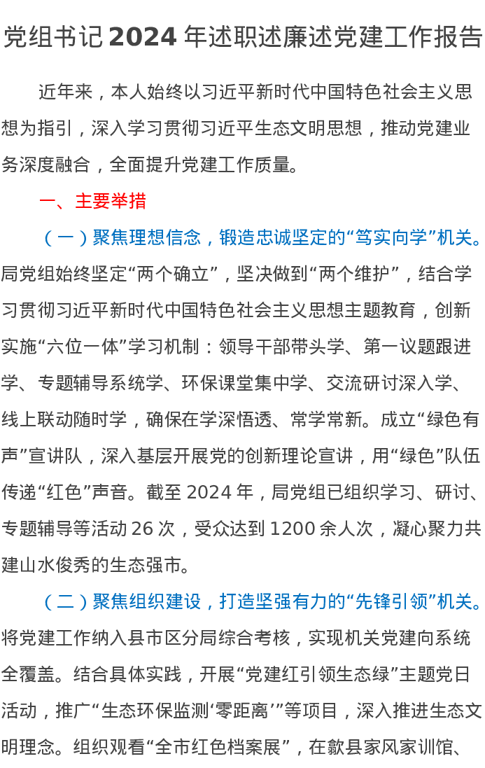 生态环境局党组书记2024年述职述廉述党建工作报告