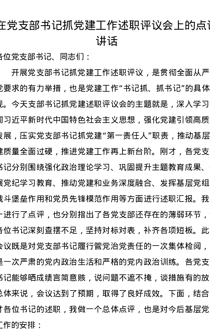 在党支部书记抓党建工作述职评议会上的点评讲话