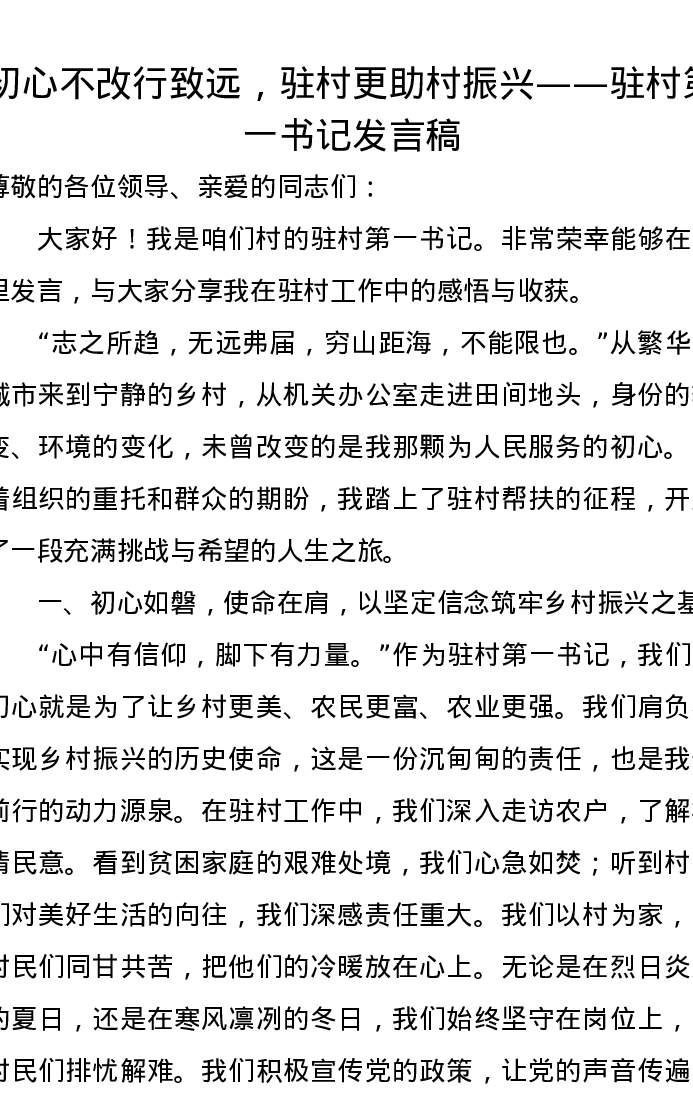 初心不改行致远,驻村更助村振兴——驻村第一书记发言稿