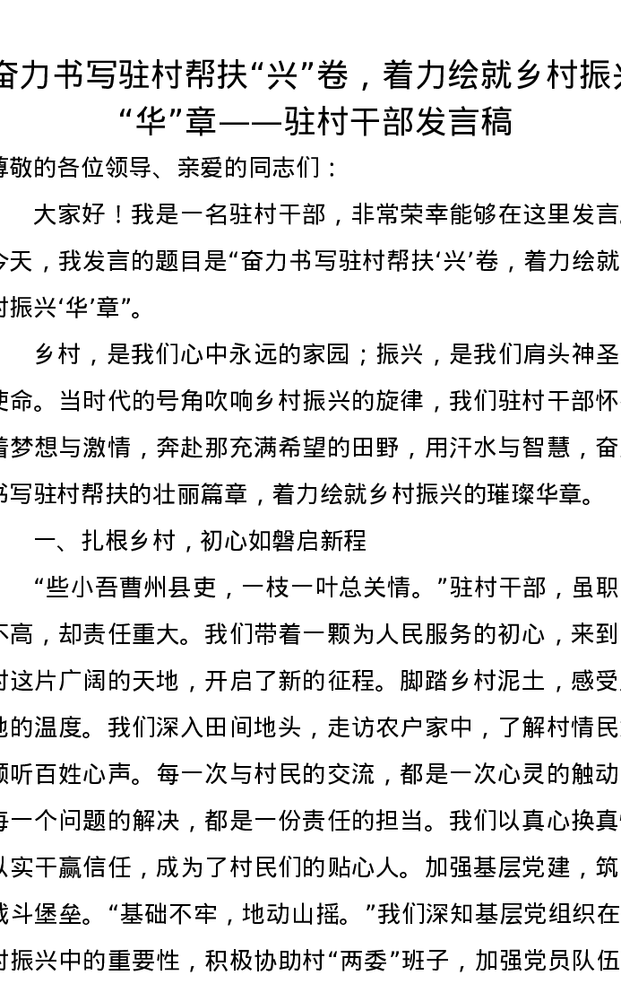 奋力书写驻村帮扶“兴”卷,着力绘就乡村振兴“华”章——驻村干部发言稿