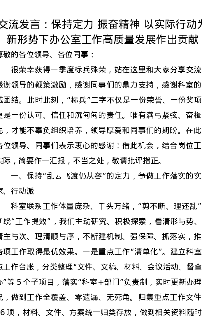 交流发言:保持定力振奋精神以实际行动为新形势下办公室工作高质量发展作出贡献