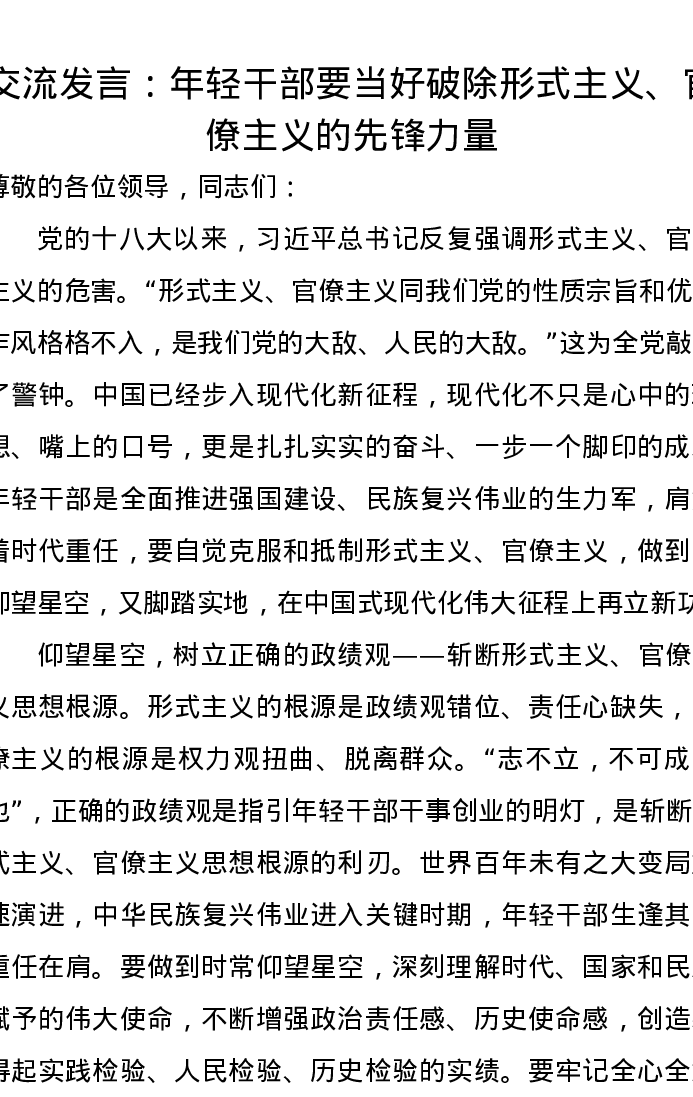 交流发言:年轻干部要当好破除形式主义、官僚主义的先锋力量