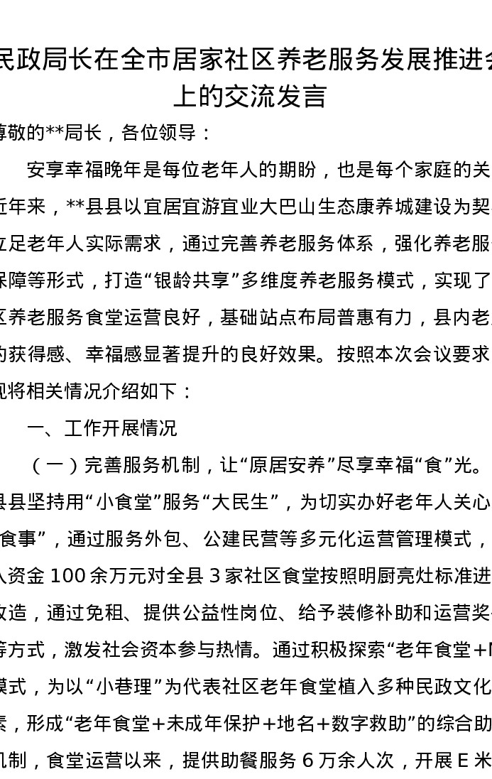 民政局长在全市居家社区养老服务发展推进会上的交流发言