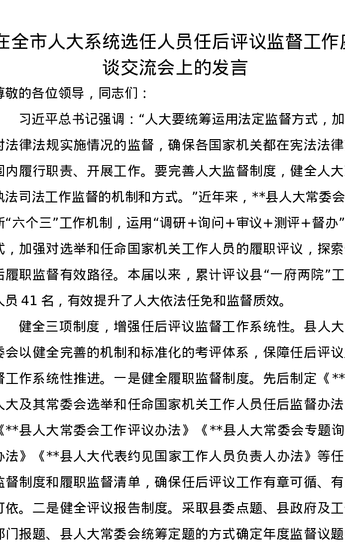 在全市人大系统选任人员任后评议监督工作座谈交流会上的发言