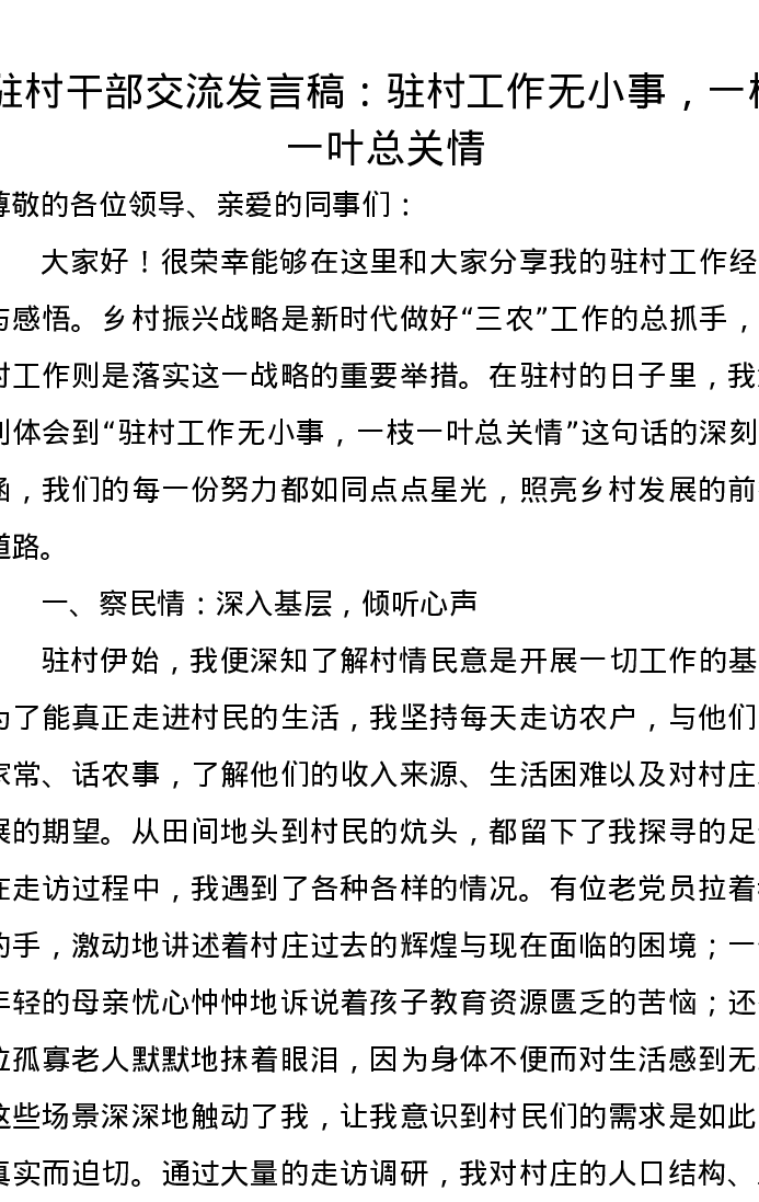 驻村干部交流发言稿:驻村工作无小事,一枝一叶总关情
