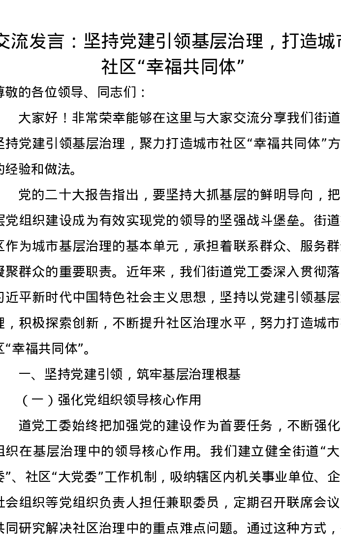 交流发言:坚持党建引领基层治理,打造城市社区“幸福共同体”