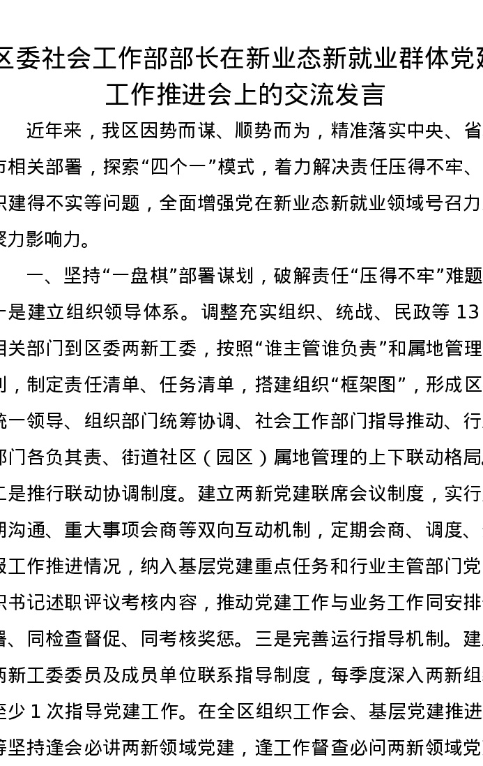 区委社会工作部部长在新业态新就业群体党建工作推进会上的交流发言