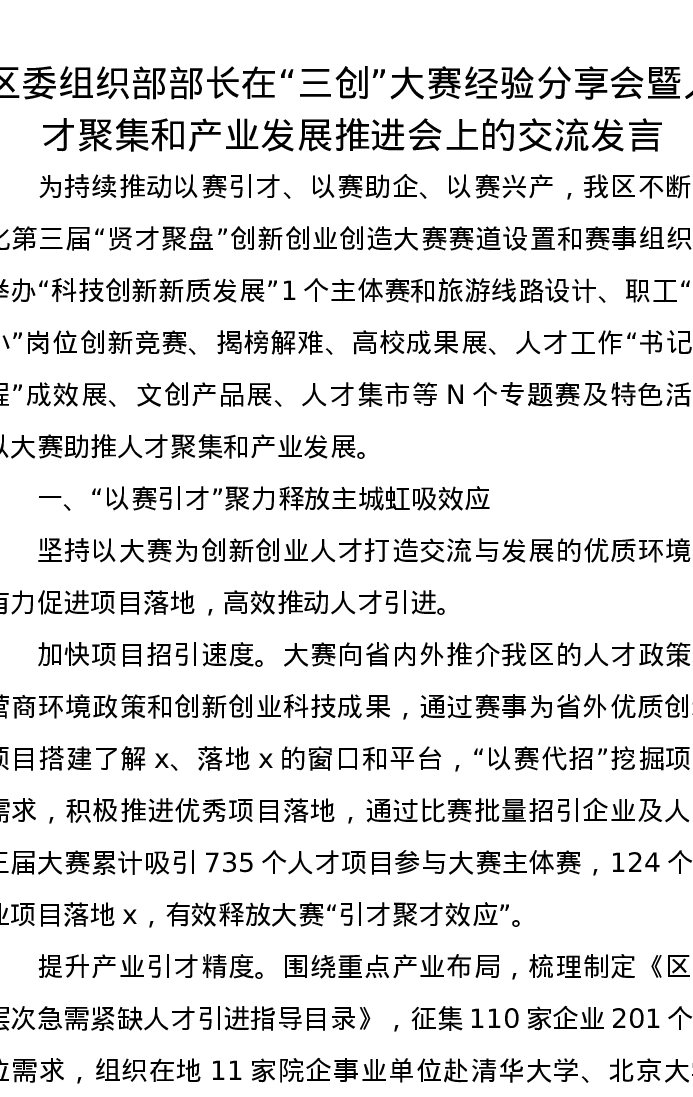 区委组织部部长在“三创”大赛经验分享会暨人才聚集和产业发展推进会上的交流发言