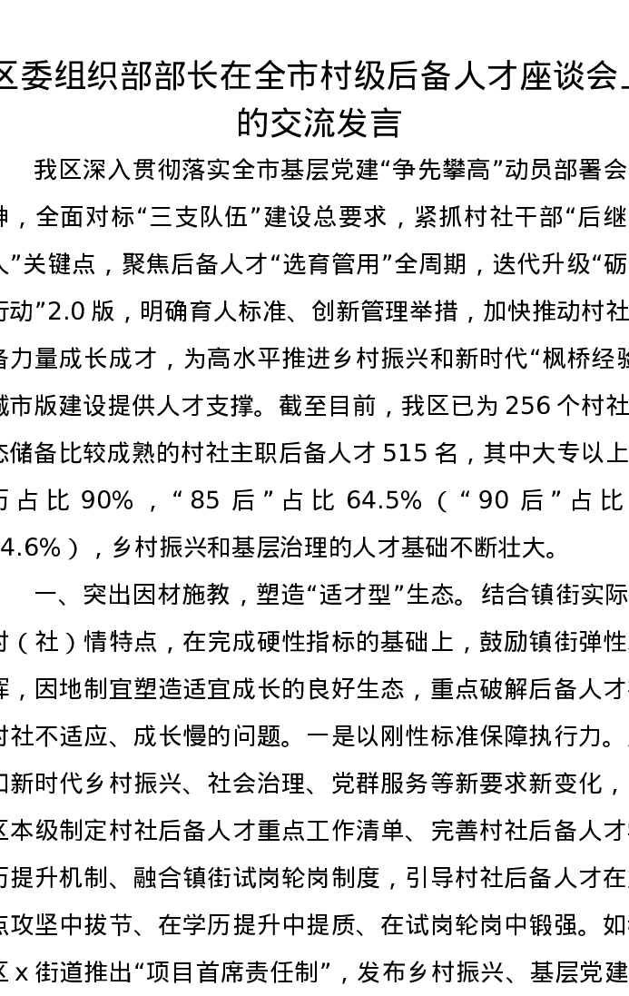 区委组织部部长在全市村级后备人才座谈会上的交流发言