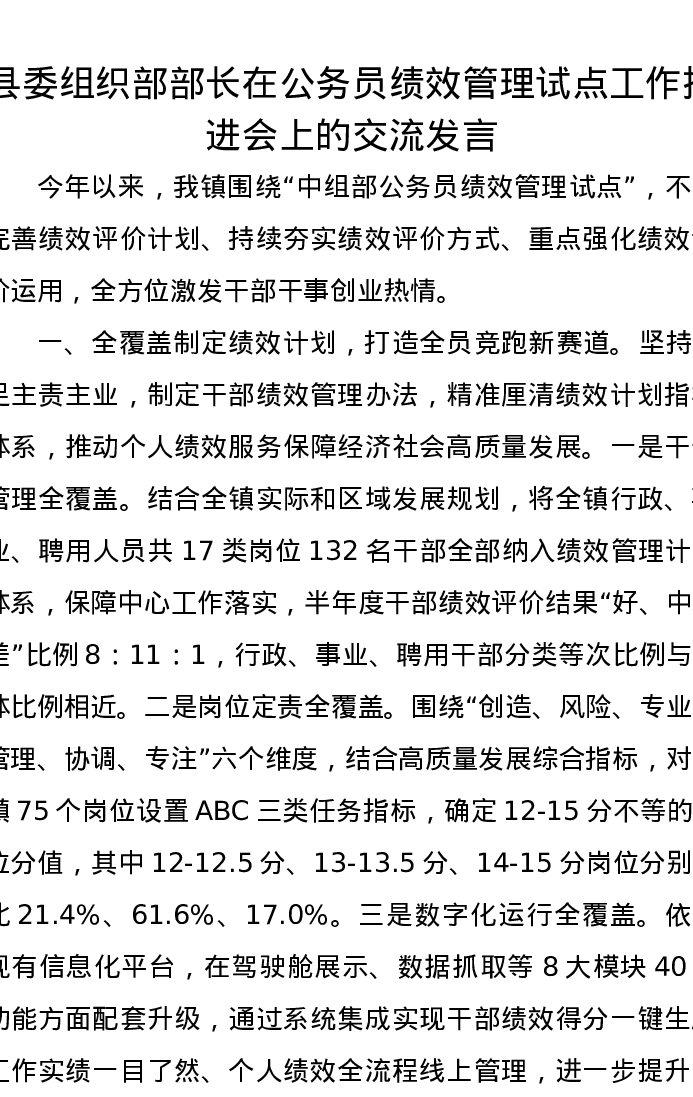 县委组织部部长在公务员绩效管理试点工作推进会上的交流发言