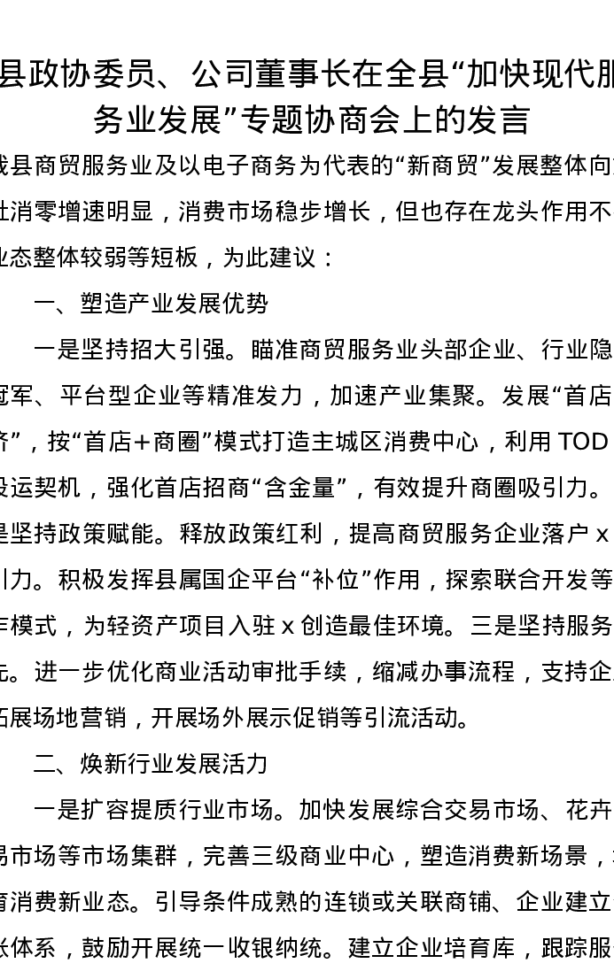 县政协委员、公司董事长在全县“加快现代服务业发展”专题协商会上的发言
