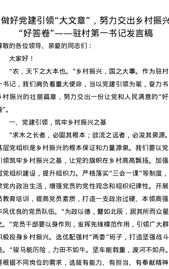 做好党建引领“大文章”,努力交出乡村振兴“好答卷”——驻村第一书记发言稿