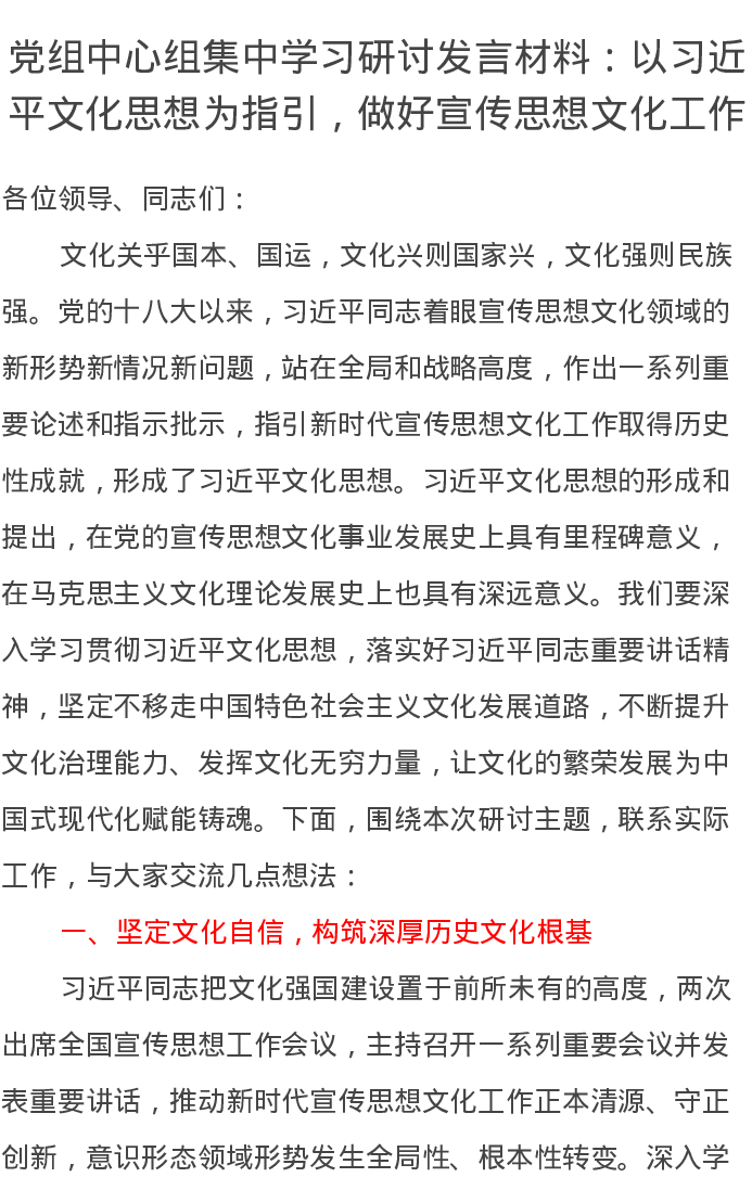 党组中心组集中学习研讨发言材料:以习近平文化思想为指引,做好宣传思想文化工作
