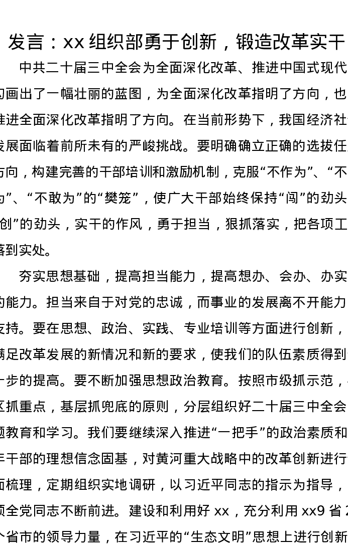 发言:xx组织部勇于创新,锻造改革实干