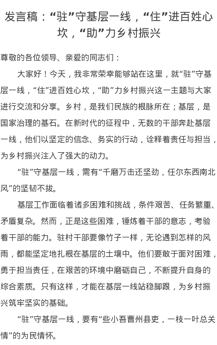 发言稿:“驻”守基层一线,“住”进百姓心坎,“助”力乡村振兴