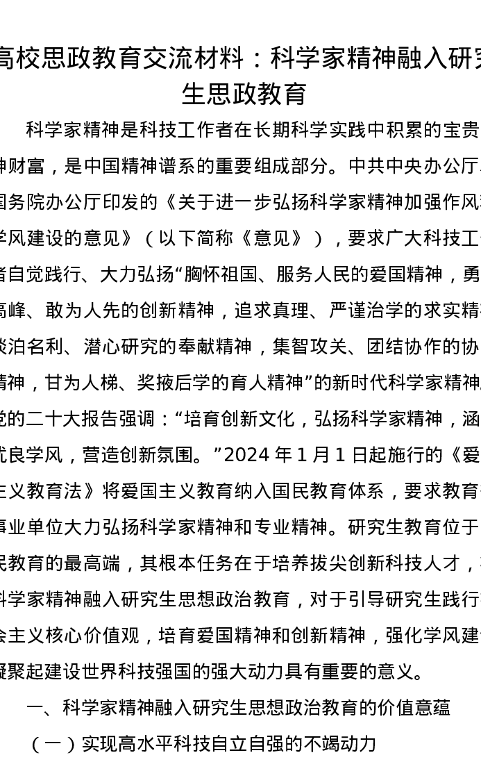 高校思政教育交流发言材料:科学家精神融入研究生思政教育