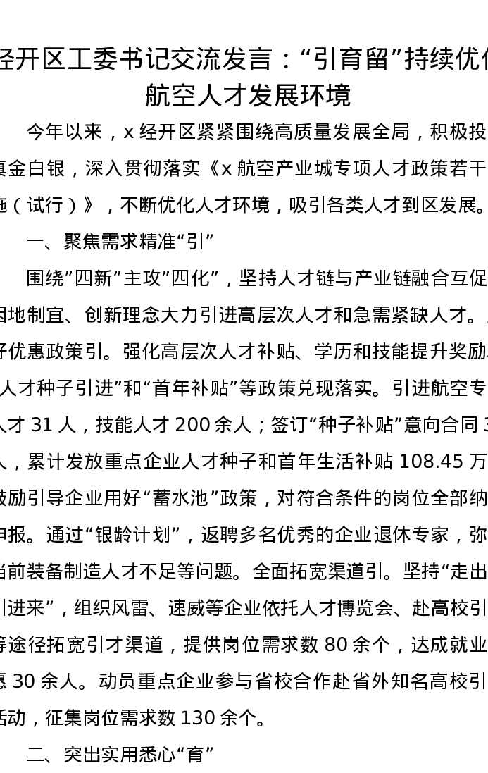 经开区工委书记交流发言:“引育留”持续优化航空人才发展环境