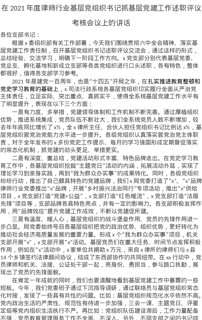 20220107在2021年度律师行业基层党组织书记抓基层党建工作述职评议考核会议上的讲话