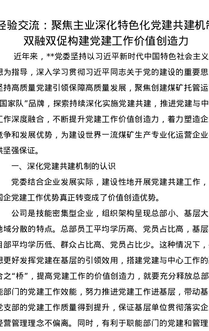 经验交流:聚焦主业深化特色化党建共建机制双融双促构建党建工作价值创造力